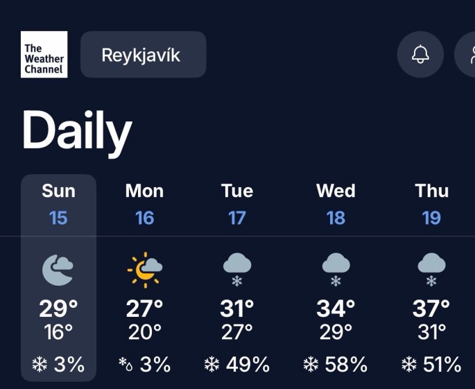 We headed North! Where you might ask……………..Iceland! Crazy right, why go to where it’s cold? Most people go south for the warmth, but we’re not most people. When you live in the heat, short trips to northern destinations have a lot more appeal. Let’s take a look at the temps.
