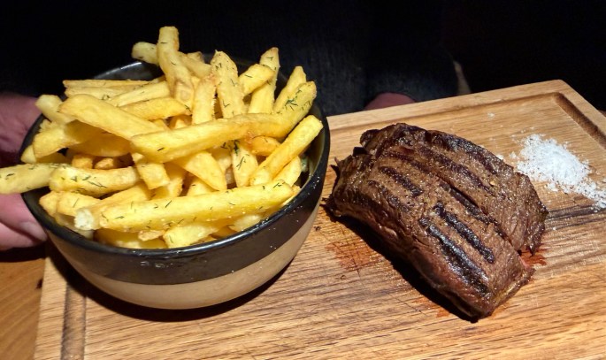 Eric chose another steak that is not available in the states. He had it one other time in Iceland when we drove the ring road. It was tasty then and this night was no exception. Horse, 220 g, cooked medium rare only.