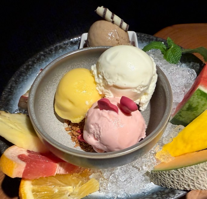Naturally, Eric chose ice cream for his dessert, which was accompanied by fruit.