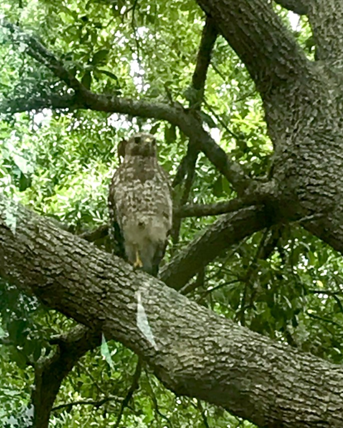 I’m still watching wildlife visiting the Darden Garden. We have two blue jays eyeing each other while the red-shoulder hawk is eyeing them.