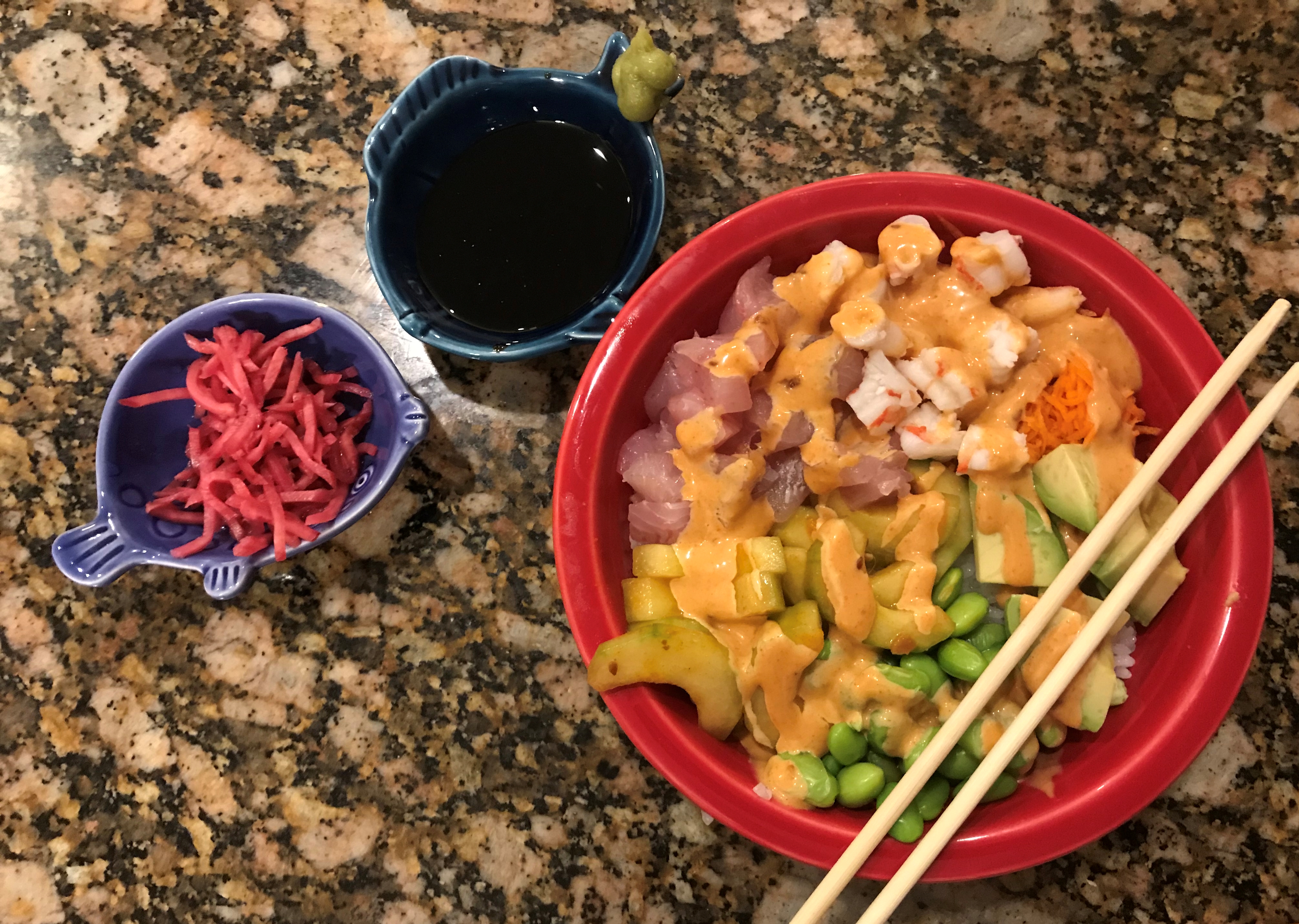 Why get excited about a Mack? It’s eaten the night its caught in sushi form – very tasty. Our Mack was eaten as a Poke bowl and included cooked shrimp, shredded carrots, avocado, edamame and sliced cucumbers. Top it with spicey mayo. Delicious!