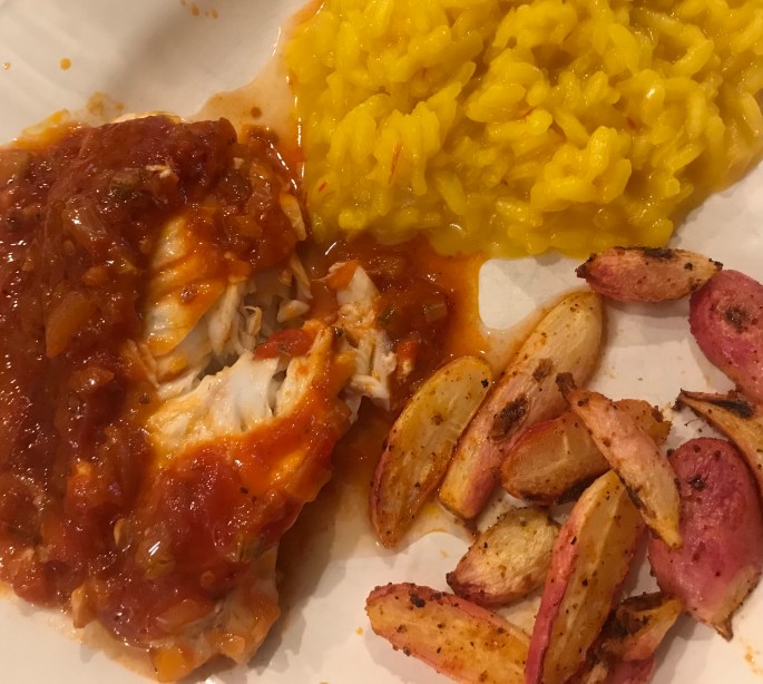 Combined with saffron rice, roasted potatoes & radishes and you have a satisfying meal.