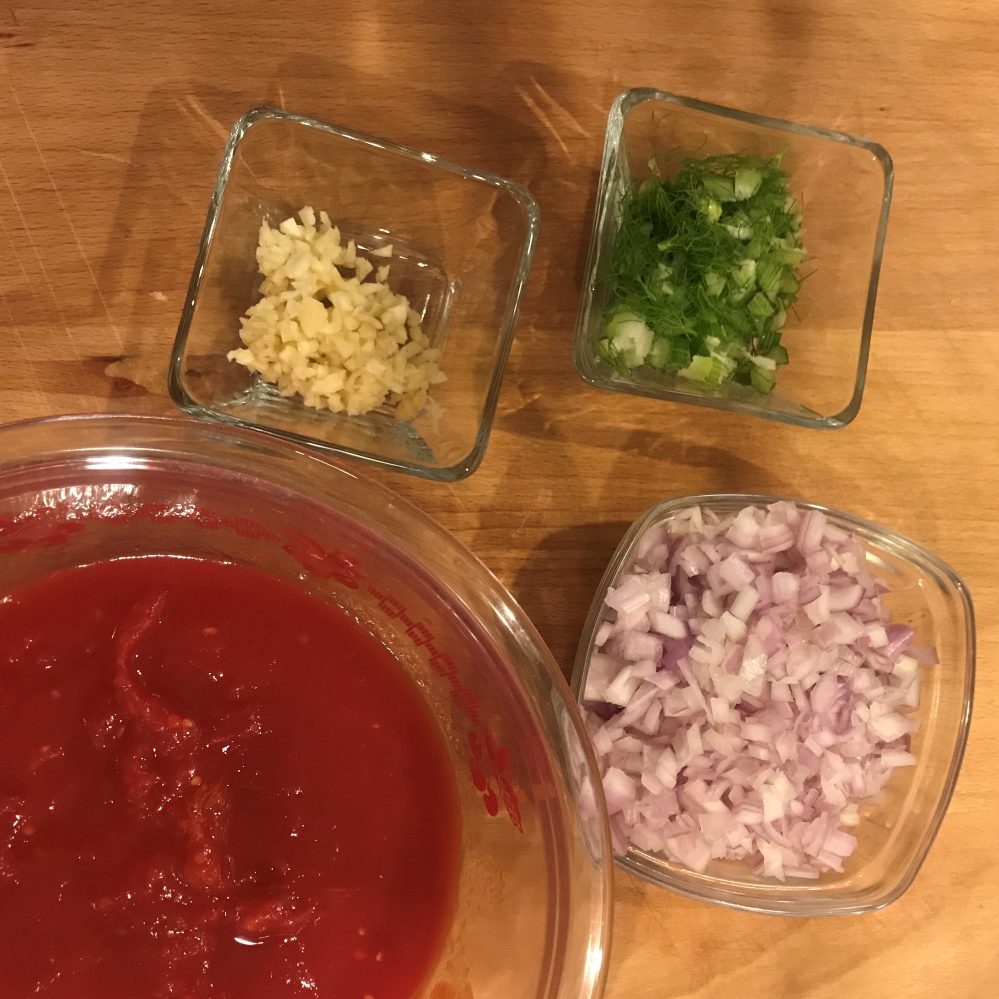 He pulled together a number ingredients to start: garlic, jalapeno pepper, shallots and crushed tomatoes. He slightly modifies recipes to cater to our tastes. The cooked sauce is on the right.