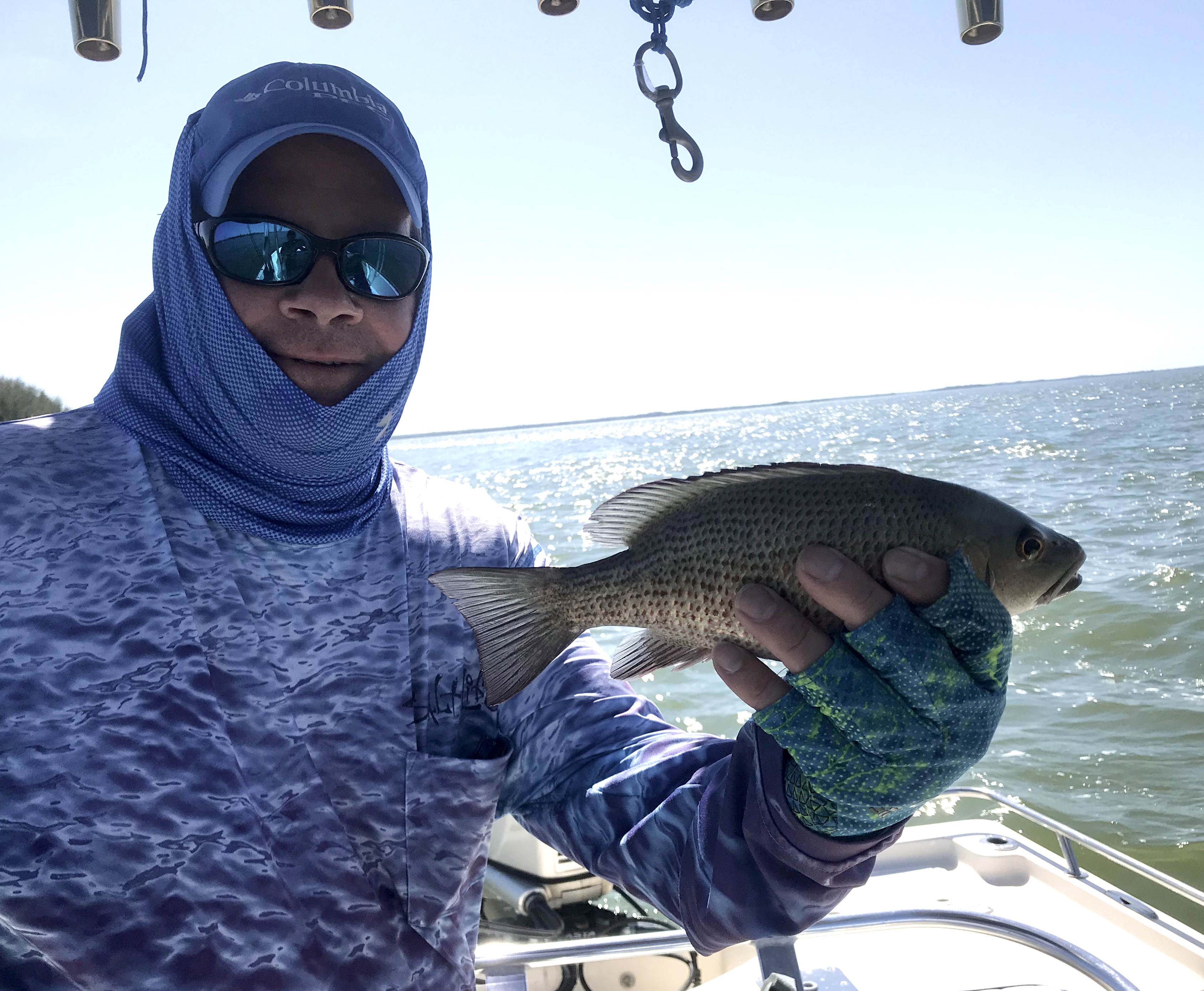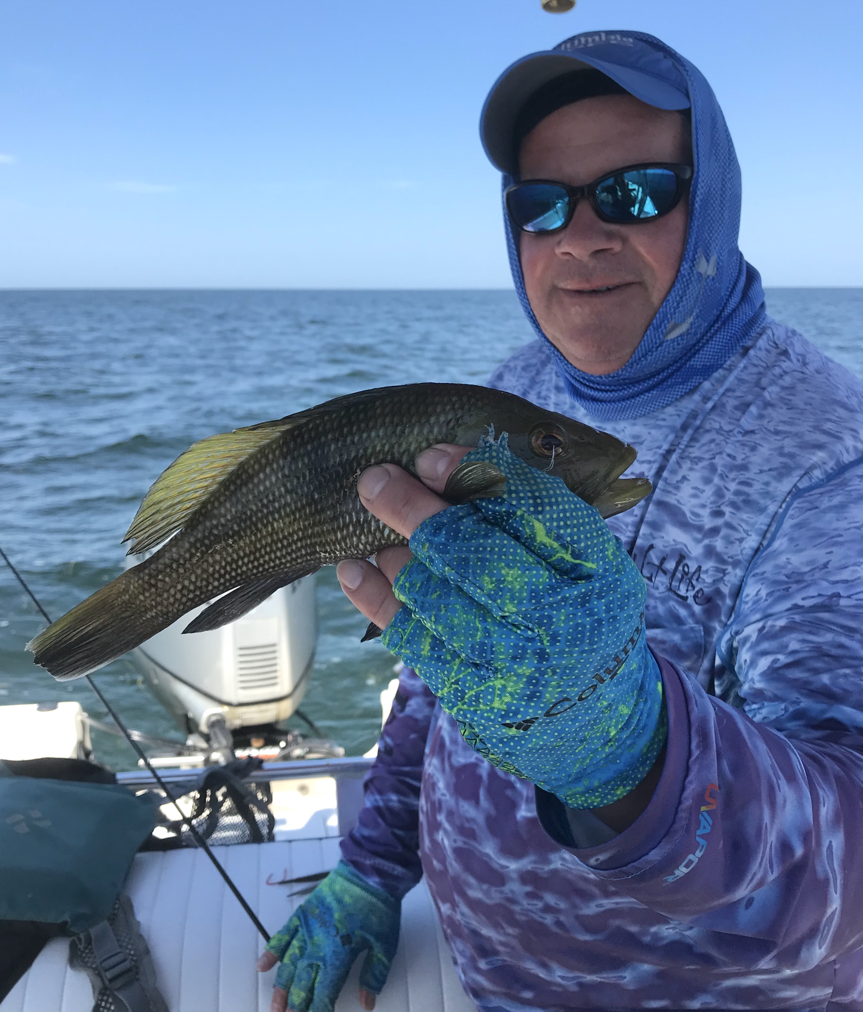 Out to the Gulf we went! It was kind of slow in the beginning, but we moved to deeper water and caught a variety of things. I got a few shots with Eric catching this black sea bass (L) and mangrove snapper (R) – both of which were kept and eaten.