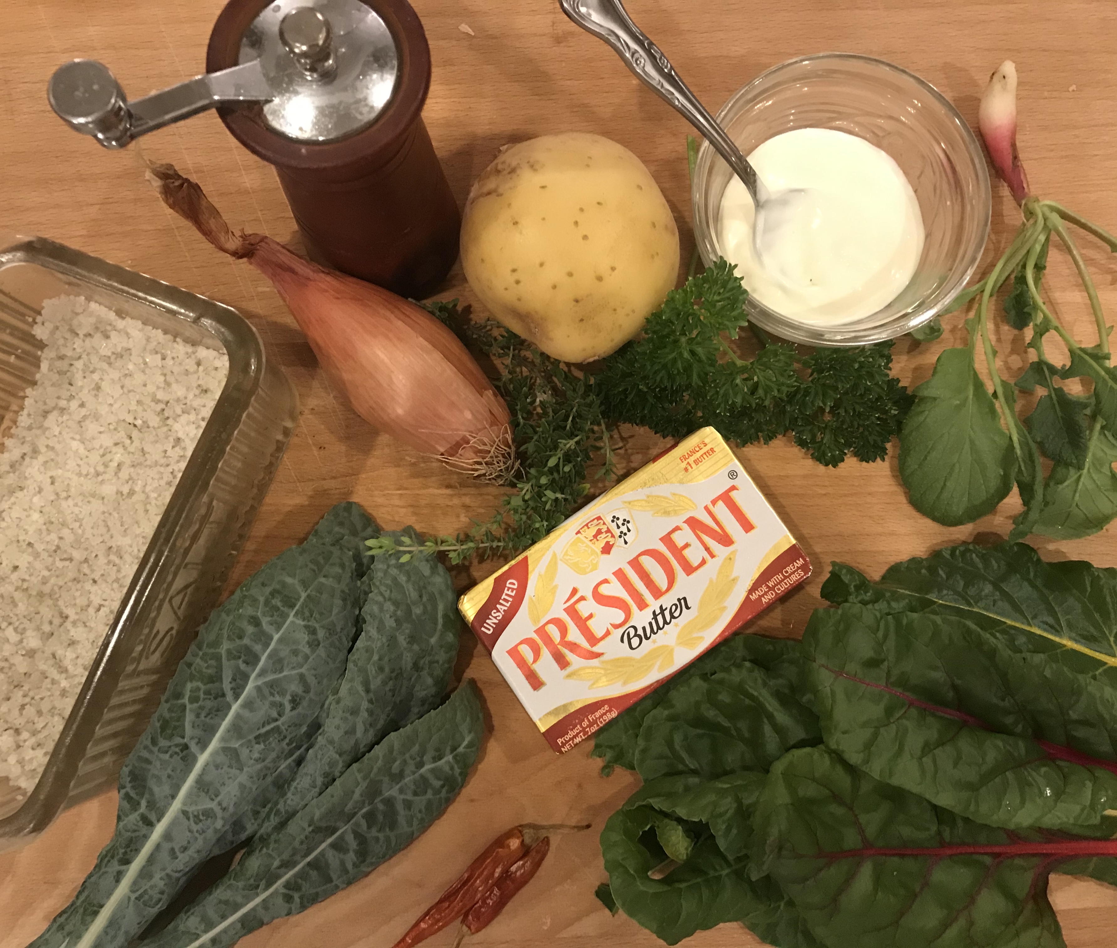 He wanted soup. He found a really great recipe that didn’t require a trip to the grocery store. All of the greens for the soup recipe we were growing, substituting radish greens for the sorrel.