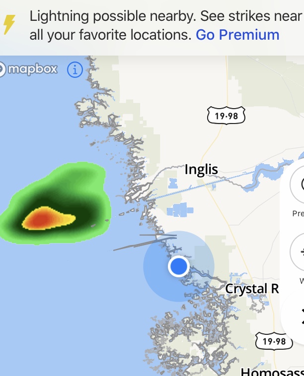 First radar shot is when we put rods in the water………….two hours later, this storm popped up, then we saw lightening on the horizon. Time to go in.