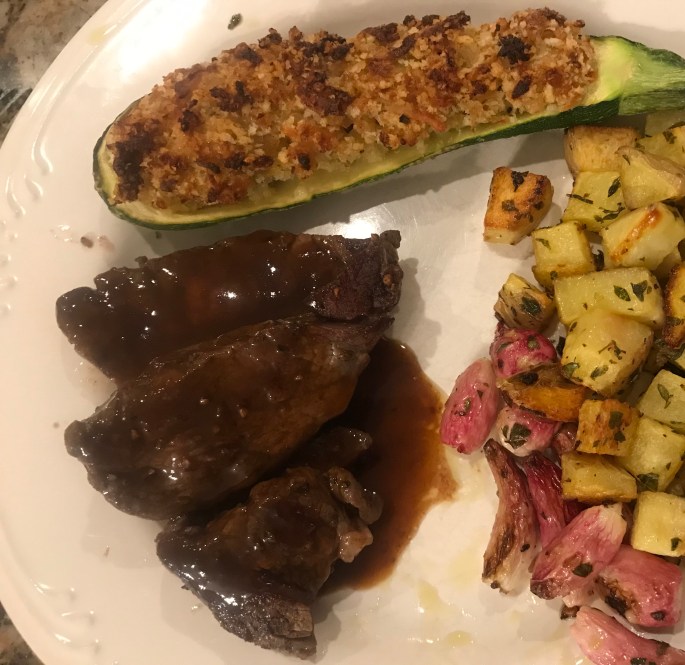 We’ve had steak with stuffed zucchini, accompanied by roasted potatoes and the last of our French radishes. Fabulous sauce for the steak (which was also good when potatoes happened to get dunked in it).
