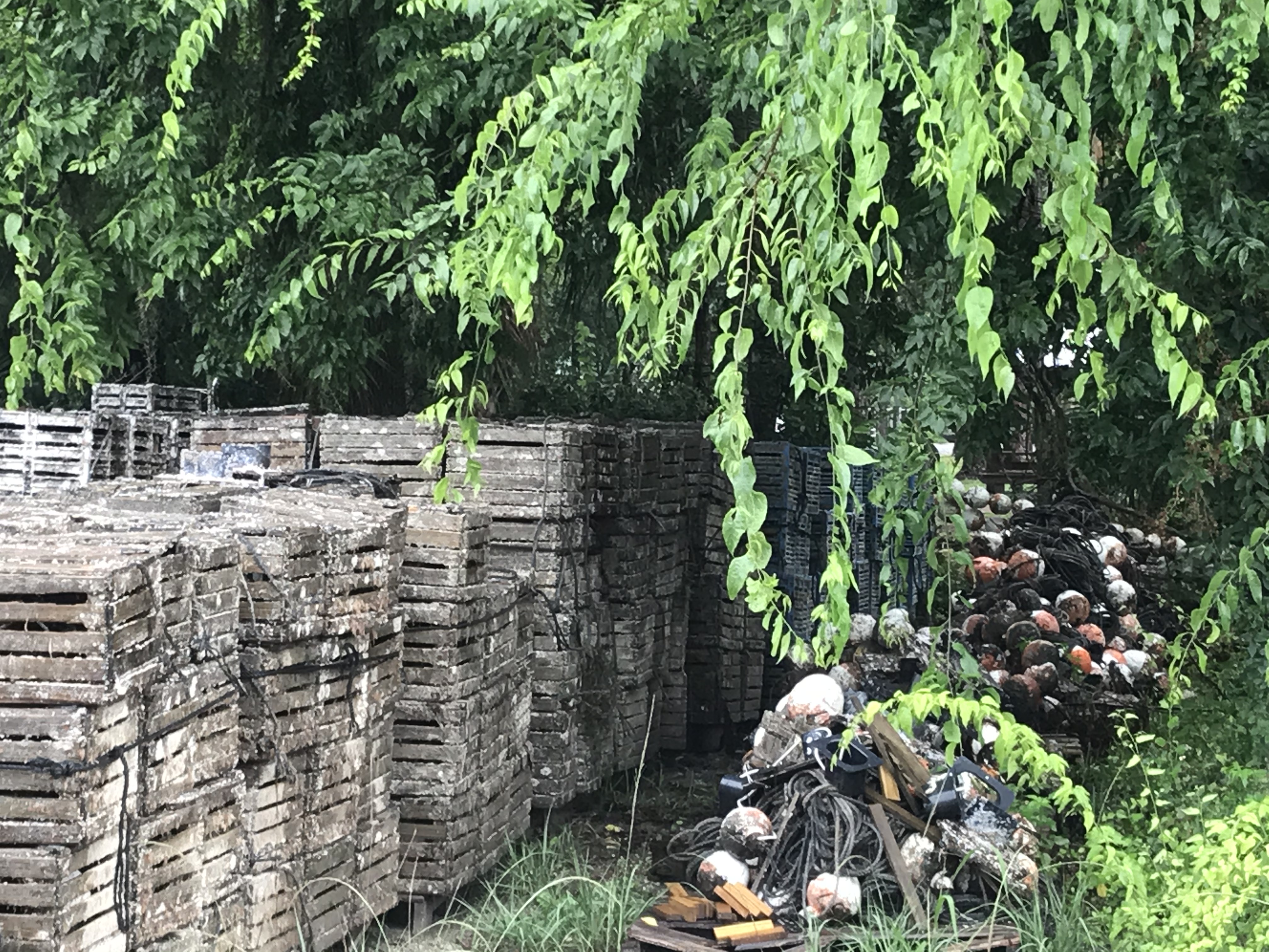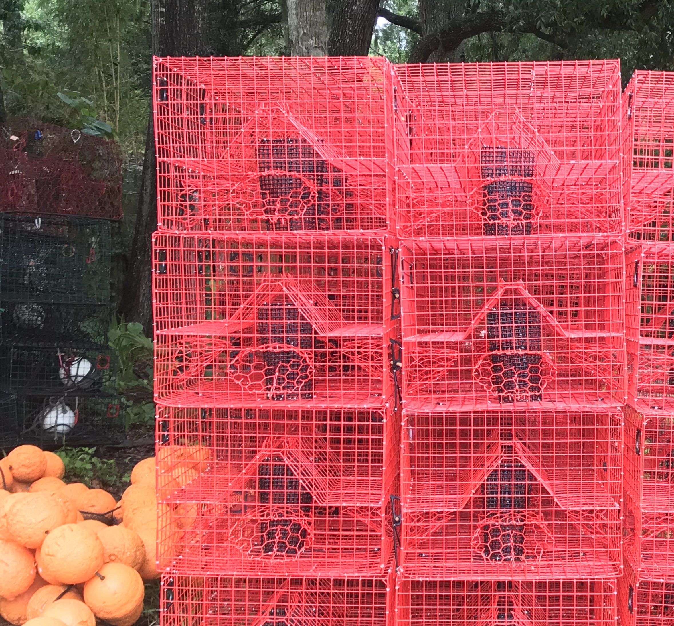 Behind the Kings Bag Lodge is a crab trap operation and restaurant. Hundreds upon hundreds of crab traps are sitting in a nearby lot. Here you see old crab traps (still in use) along with the newer coated-metal traps.