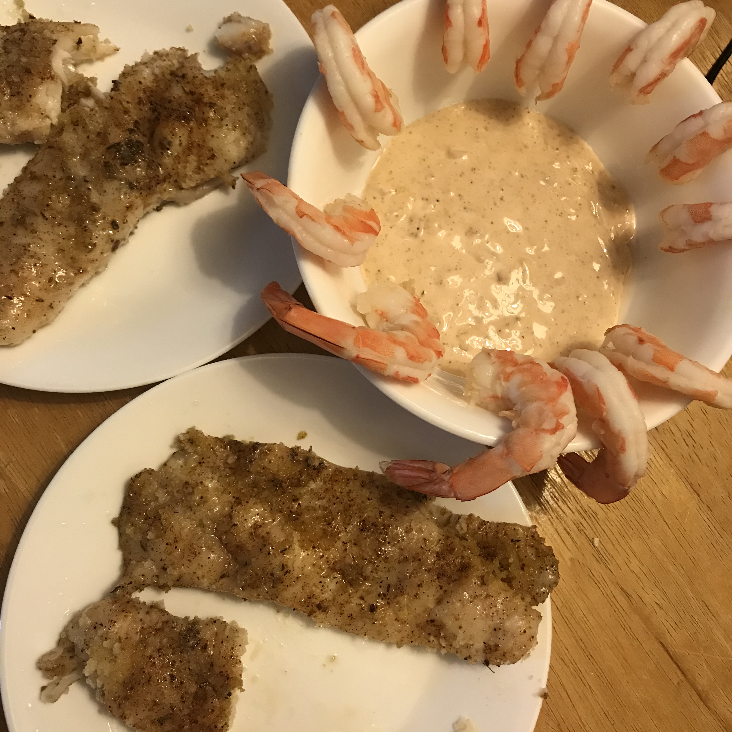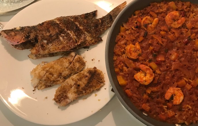 Eric also got up (somewhat) early on Monday and went home to pick up the boat. Ultimately the weather Monday afternoon did not cooperate, so we found a new place to pick up some seafood. Eric got to use his culinary talents again. Poached local shrimp and grilled Grunt with bread crumbs was very delicious!