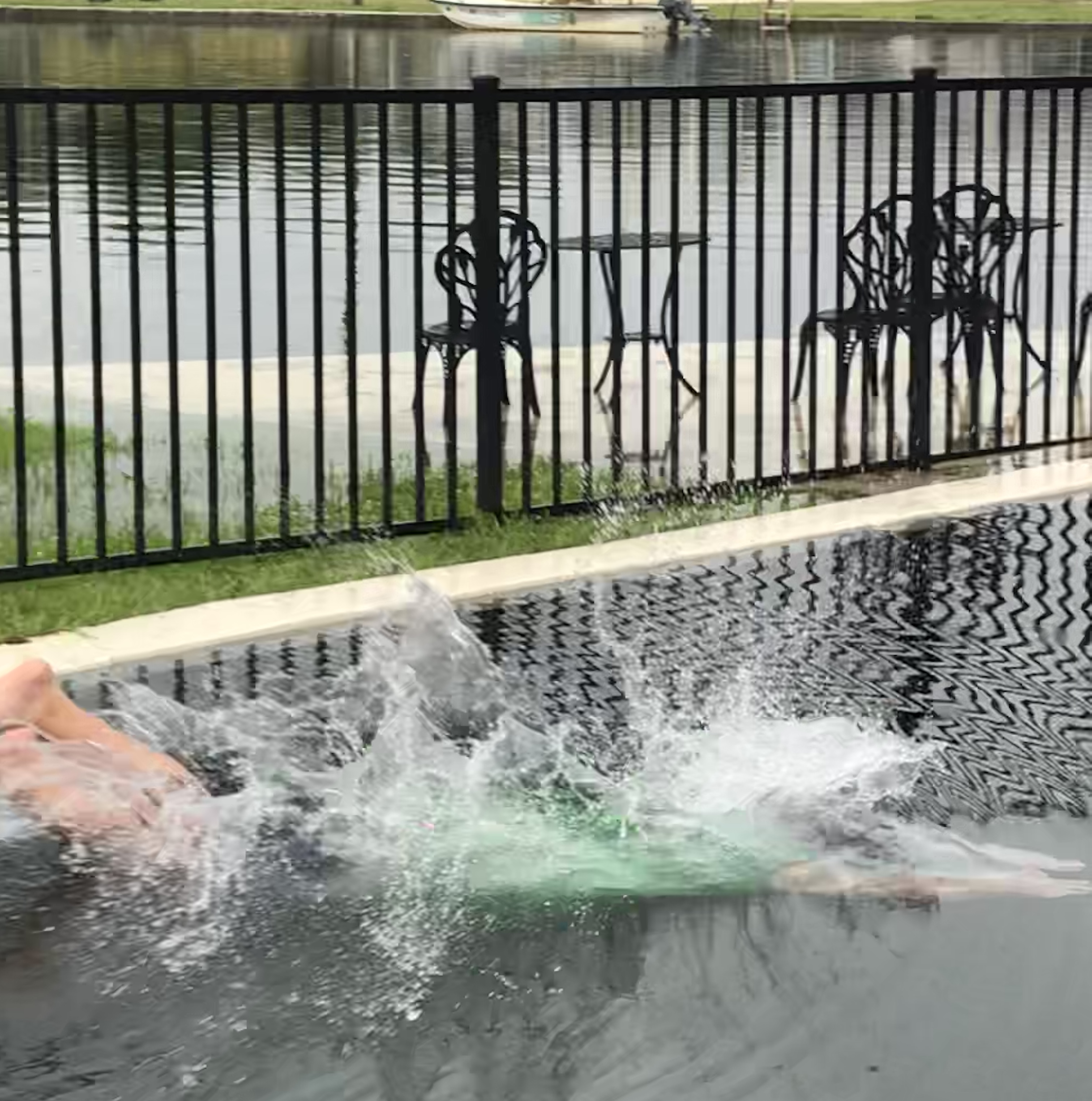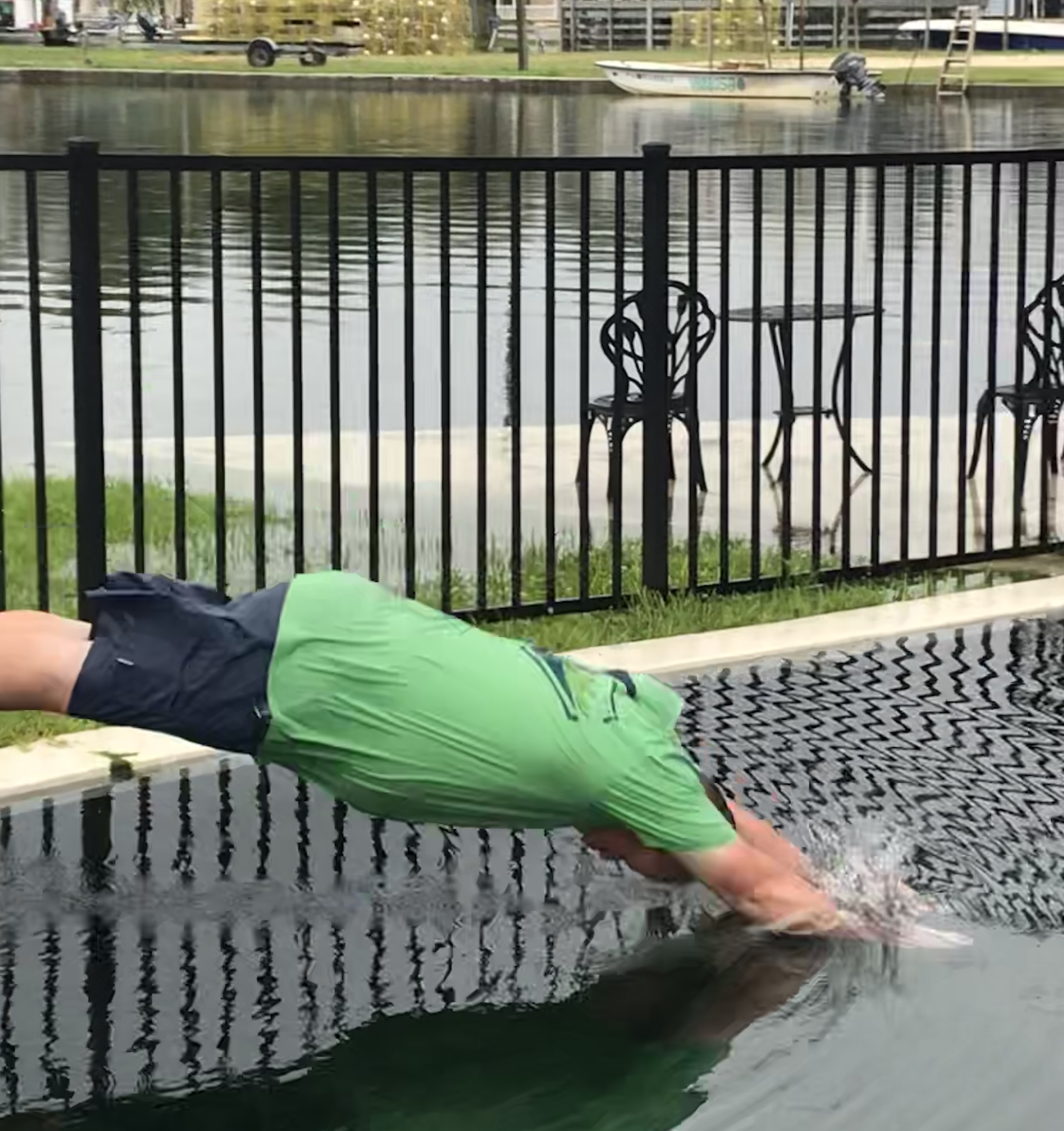And then he jumped into the motel’s pool, which is filled by a nearby diverted spring. Look at that form! The water is the same temp year around 72 degrees F – that’s cold for some of us (mostly me, ha!).
