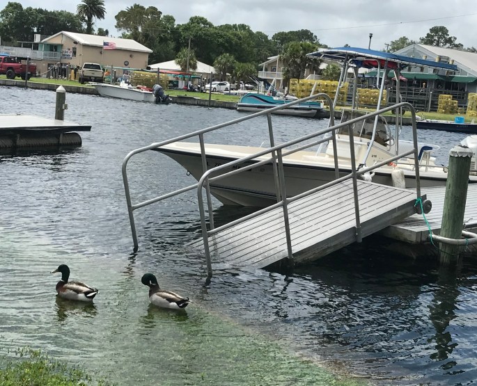 The last post mentioned it was going to rain and rain and rain while we were at Crystal River celebrating my birthday. Upon checking into our motel, we walked out to the dock – where the boat should have been – and saw the results of tropical depression rain + high tide = coastal flooding. Yikes!
