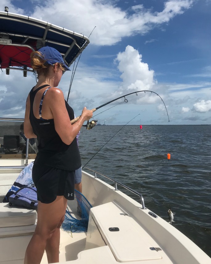 After picking up some shrimp from Pete’s Pier, rain was coming down harder, but there was a break in the clouds. It should be enough for us to motor out to the Gulf to fish. Let’s just say it was a ‘bear’ getting to the break in the clouds. Adrienne and I were sitting in the front of the boat, covered by a beach towel (soaking wet by now) to break the stinging rain. Yes, rain hurts.