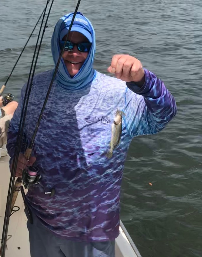 We all caught some fish that day. At one point, Rich showed us one small little seatrout that he commented was his smallest seatrout ever caught (it got thrown back)…………until Eric hooked this guy. Yep, that is one tiny trout. I think the shrimp on the hook was almost the same size.