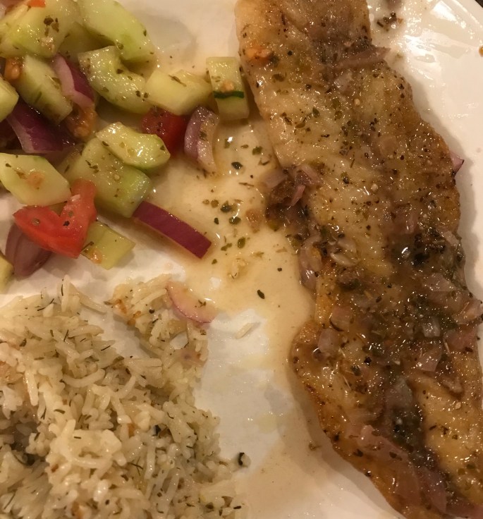 Which turned into dinner the next night Greek-style: lemon-rice pilaf, Greek cucumber & tomato salad and seatrout sauted with herbs, topped with a squeeze of lemon.