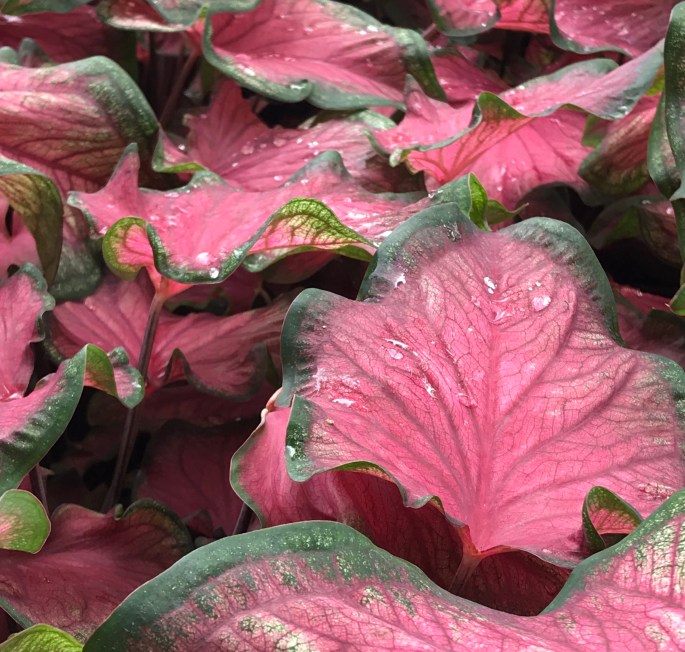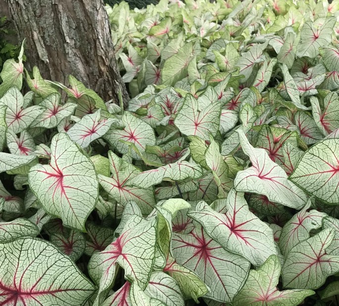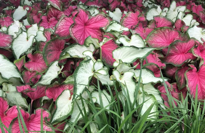 However, there’s something that hasn’t changed……………..Disney’s colorful landscape! Summer in Central Florida is a tough season to grow flowers. Caladiums make great colorful addition to flower beds. Did you know that Lake Placid, Florida is the Caladium Capital of the World, growing 95% of the world’s caladiums? They grow from a bulb and come up a number of years, until something eats the bulb or it finally degrades. There are a number of flower beds planted with these bulbs and they bring a shot of color. There are hundreds and hundreds of varieties, types & sizes.