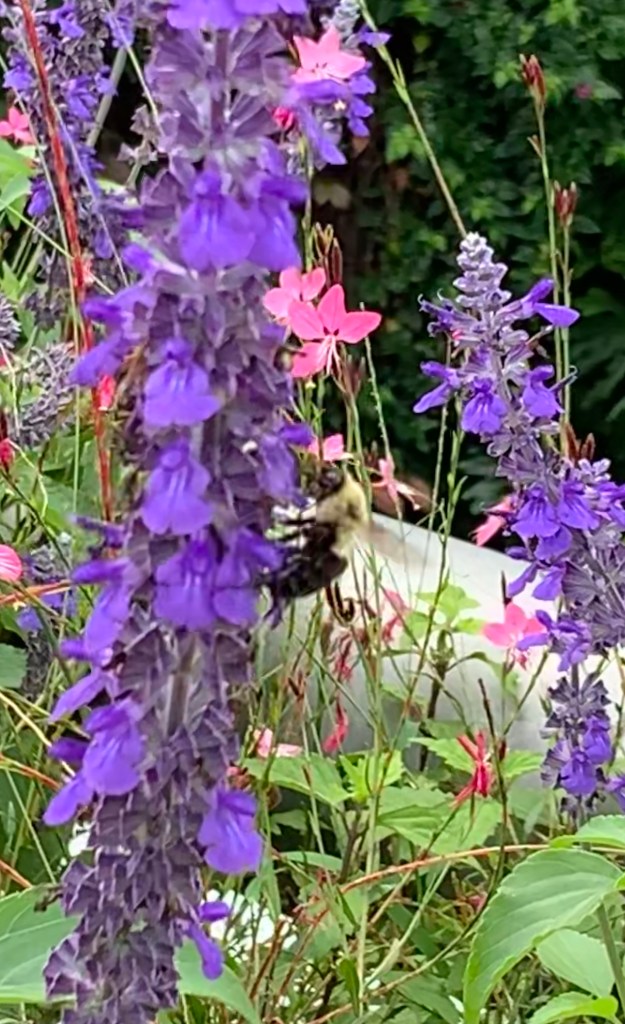 Every day I walk the park and eventually pass by this pair of flower beds, it makes me smile. Love the colors, love the flowers. Check out the bee in one of the photos.