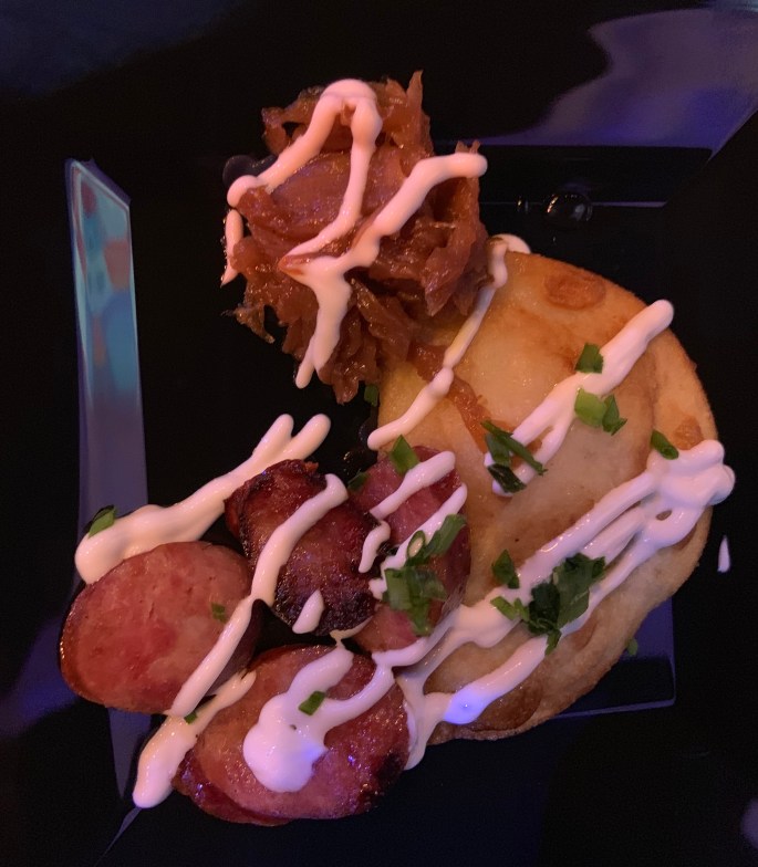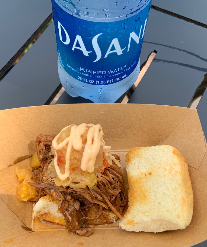 Like a normal (Epcot) festival, there are a number of food booths, situated mostly around the lake. Although it is super hot, muggy, sunny, hot, muggy, sunny – you get the picture – a girl’s got to eat. Adrienne met me for lunch one day to sample some food offerings. First stop was the Hawaii kiosk, choosing the pork slider with pineapple chutney. Definitely sounds weird, but it works.
