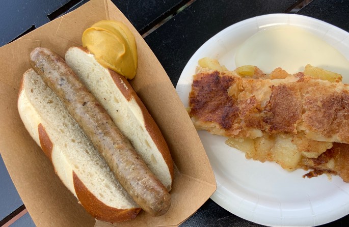 Stopping in here was a nice chance to cool down. After a bit of noshing, we braved the heat and continued walking around the lake. One more booth drew us in – the kiosk at Germany. We couldn’t resist the bratwurst on a pretzel roll and the apple strudel. Man – just seeing this photo makes me want to go back for another (both!).