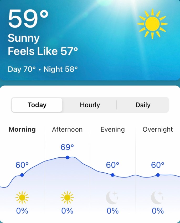 This was our first day of getting the boat into the water and fishing. This was the day’s forecast. Doesn’t look bad – right.? A little bit chilly, but we brought lots of layering to peel off as the temps rise.