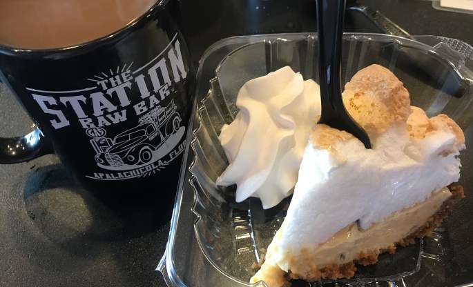 I was done with oysters for the day. I needed dessert (and coffee). Key lime was my selection this day. It was okay – NOT as good as Indian Pass Raw Bar, but all enjoyed several bites. We left nothing behind.