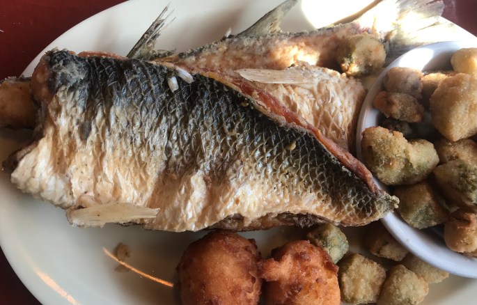 Eric got their smoked mullet special of the day with fried okra.