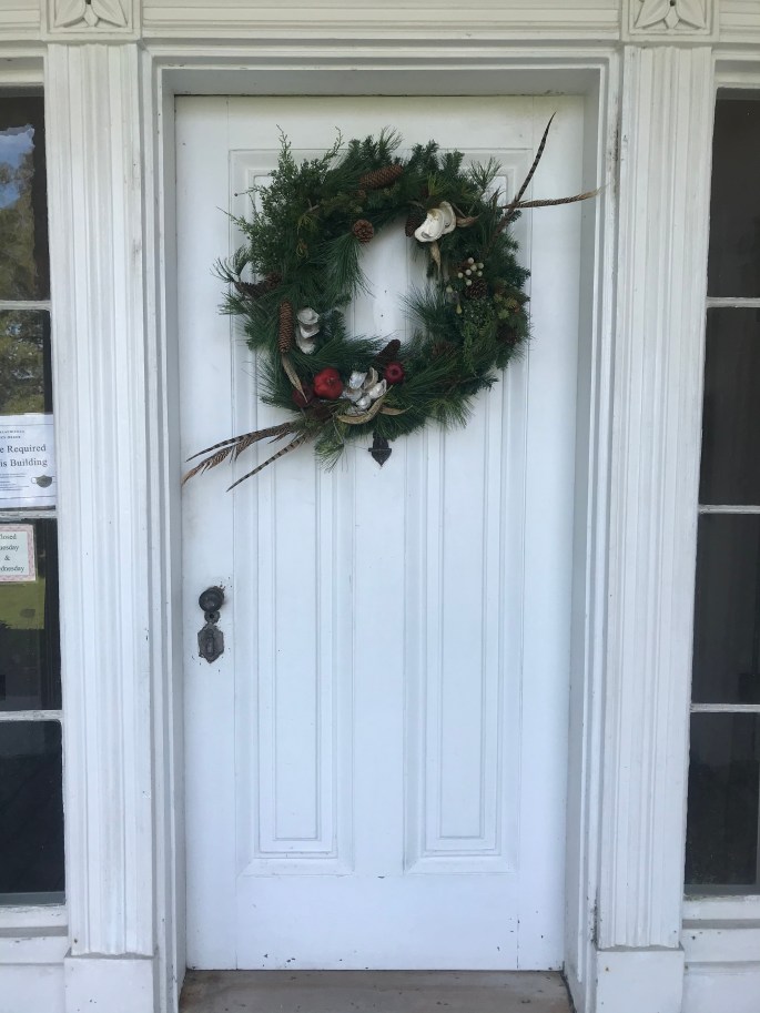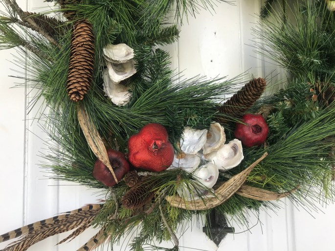 I was a little chagrined when I saw a holiday wreath on the front door – until I saw one of the components, oyster shells. 🙂 Hhhhmmmm, interesting idea.
