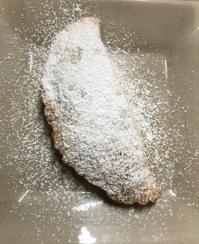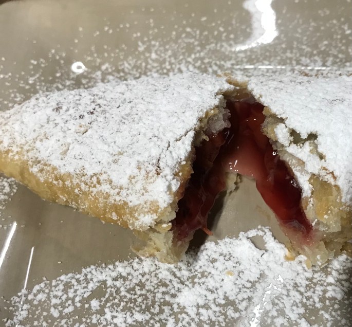 Dessert had nothing, I mean nothing to do with Asian cooking, but was my request: fried fruit pies. Full disclosure, they were supposed to be peach pies from last year’s Florida peaches we froze. Alas, it was not to be. Ask Eric what happened to the peaches………….. Therefore, at the last minute, Eric had to drive to the grocery store to get pie filling. I requested cherry pie filling and OMG, these fried fruit pies so, so, so delicious.