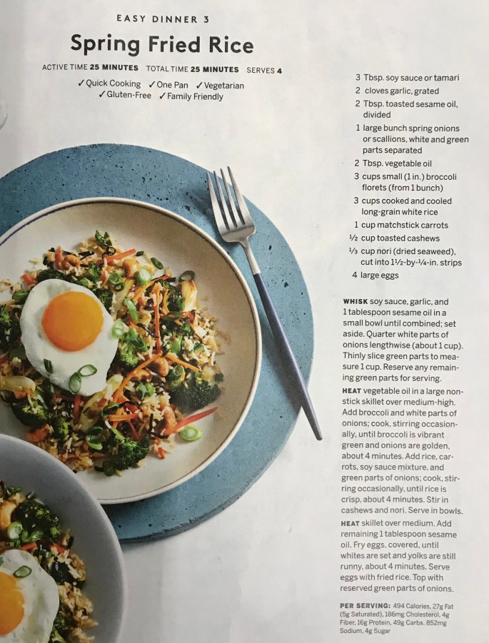 Another evening we had fried rice, similar but different than our previous renditions. Here was the inspiration. See Eric – tearing pages out of magazines do serve a purpose!