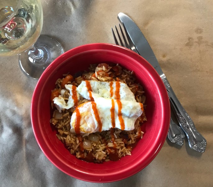 LOVED the thought of putting an egg on this dish. Our fried rice ingredients were bits of pork, sliced carrots and one and half yellow onions. Add a (healthy) drizzle of sirachi sauce and here’s your finished product. Going forward, soft-cooked eggs will always be included.