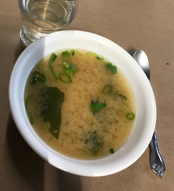 He started our night of Asian influence with Miso soup – from scratch. It was tasty. Not something I’ve ordered when we were out, but it was a nice start. A little glass of sake accompanied our meal.