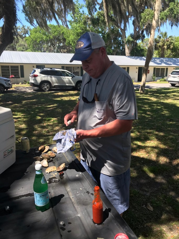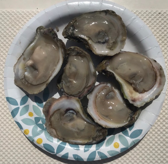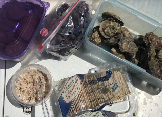 We usually pack lunching items while on the boat and today was no different. Our choice of lunch was not the norm………tuna salad – yes, crackers – yes, fruit of some sort – yes, oysters – not usually. Don’t forget the cookies in the upper left corner of the photo. Sit them on top of the deck for a few minutes and YUM, they taste like they just came out of the oven with ooey gooey chocolate chips.