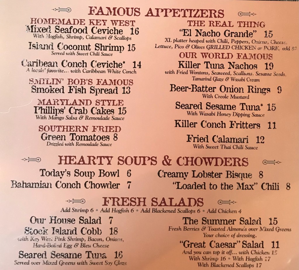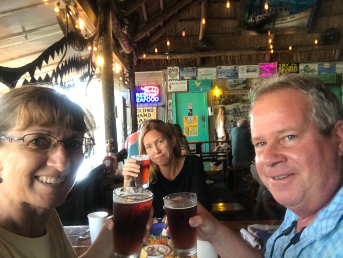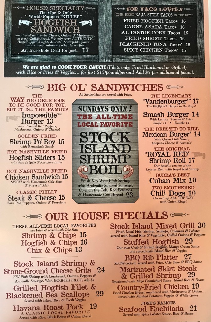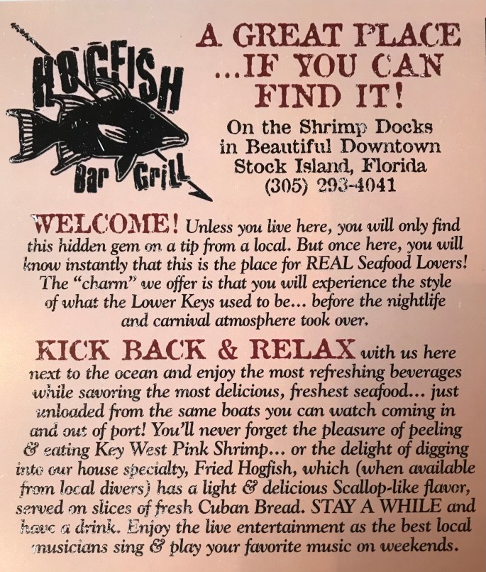 Dropped the bags and headed further south for our first night in Key West. Eric found a really cool place – Hogfish Bar & Grill. VERY low key and local, no AC, all seating was open-air, but covered – thank goodness – with lots of fans. Yep, also considered a tiki bar.