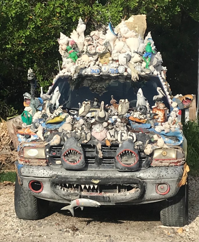 Somebody had waaaaaay too much time on their hands. Not sure if the truck runs, but would definitely be scary if it did. This was sitting across from the bar.