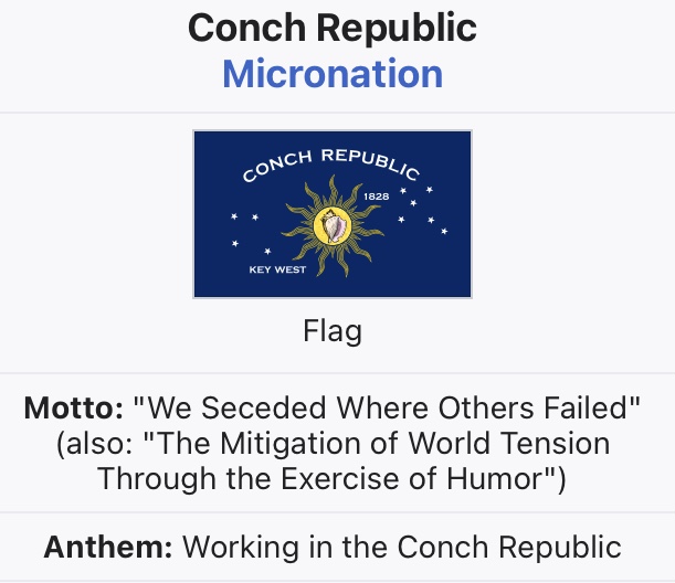 The phrase ‘Conch Republic’ was seen throughout Key West. Conch Republic – what is that? In 1982 Key Westers protested the US Border Patrol roadblock and inspection point on US 1, prior to driving into the keys. Vehicles were being stopped and searched for narcotics and illegal immigrants. When their complaints went unanswered they declared their Independence day on April 23, 1982 when they seceded and created the micro-nation for the city of Key West. Its turned into a tourism booster and one more quirky Key West thing.