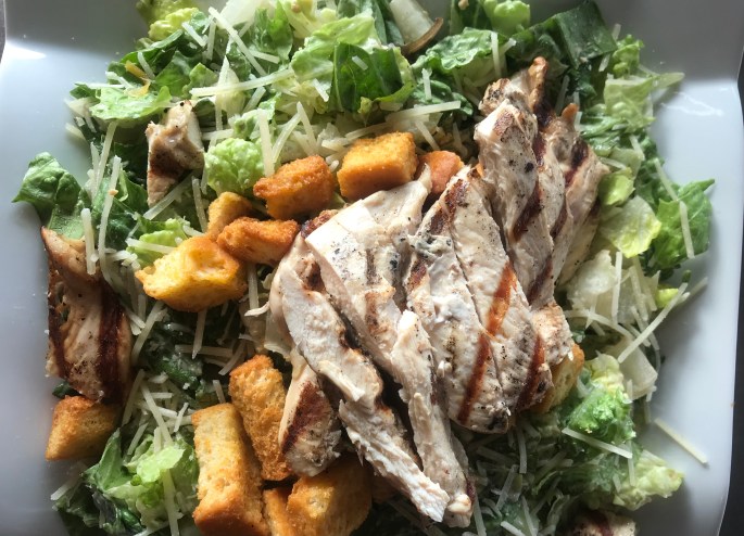 And what did I get…………………..yep, grilled chicken caesar salad. I’d had enough seafood for awhile. I needed something a bit lighter and greener. It was a wise choice. While the grilled chicken was a bit dry…………bottles of hot sauce on the table remedied that situation.
