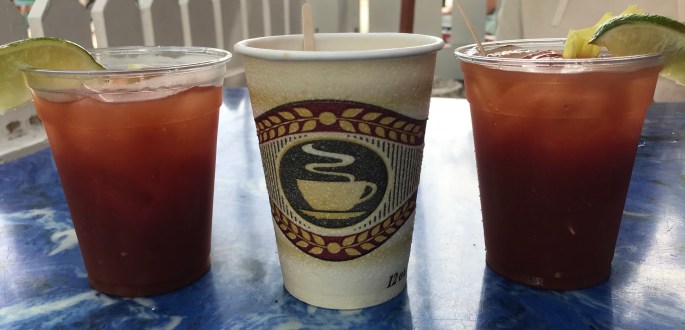 We had a 30 minute wait for our table and the ‘waiting area’ is across the street in an off-shoot of their business ‘Andy’s Cabana’. Adrienne and Eric started with a bloody mary. They both said their drink was a healthy pour of spirits. Another one of those and they would have had a different view of Key West. I ordered the coffee in the center.