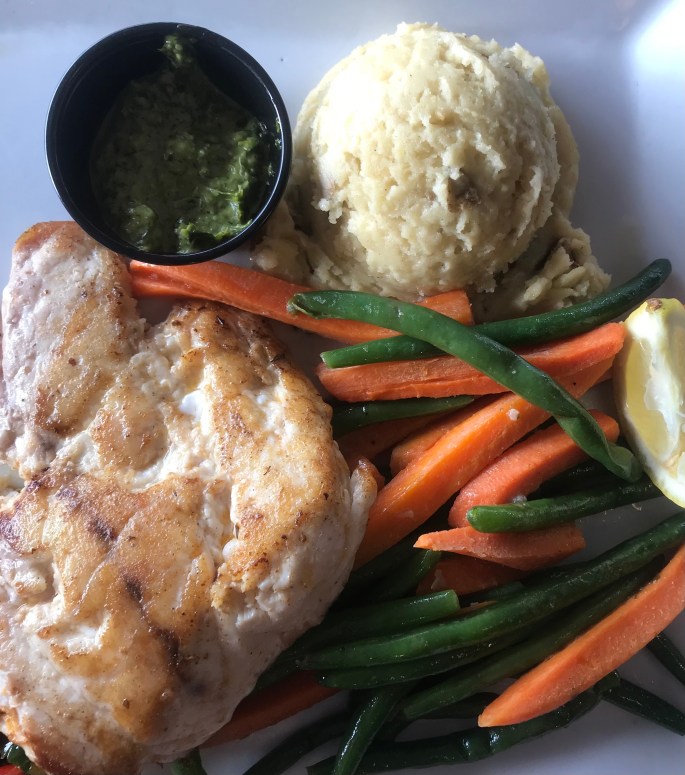 Eric’s meal was yellowtail snapper with garlic mashed potatoes and steamed veggies.