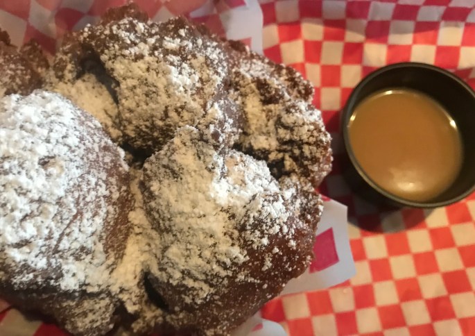 Checking out their website before coming, these things were top of mind and there was no doubt they would be ordered. Beignet Poppers: homemade apple cinnamon puffs topped with powdered sugar and served with Angry Orchard Cider-salted caramel sauce. Wow. A lot of words for a dessert. They were yummy. But let’s be honest………..they were fritters, not really beignets.