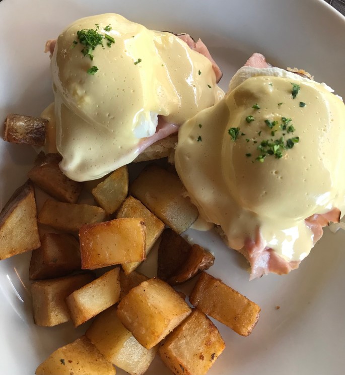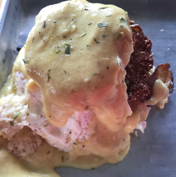 I got another ‘benedict’ with the egg sitting on top of another biscuit with smoked bacon and a fried green tomato. More yumminess.