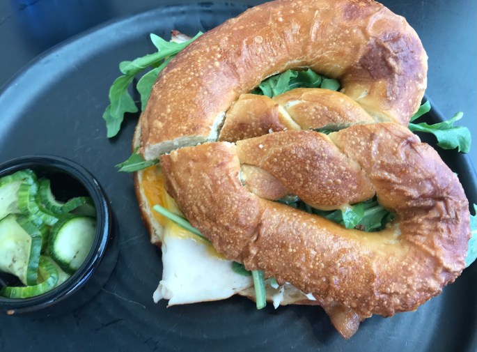 Small menu for their Sunday brunch but I ate every single crumb of this pretzel roll, roasted turkey club sandwich with aged cheddar cheese, applewood smoked bacon, vine-ripe tomatoes, argula, peppercorn aioli and a tangy honey mustard. Man! Everybody likes to include lots and lots of descriptors for their menu items. The photo may not look very exciting, but nothing was left on the plate.