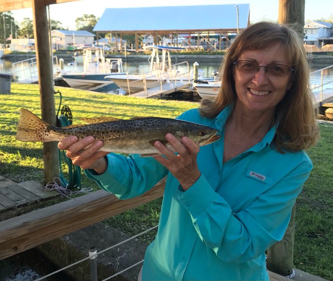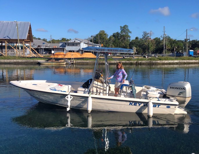 While no photos of that night’s prepared meal, the fresh trout was delicious. All too soon it was our last day of fishing. Eric likes to grab a photo of me on the boat leaving KBL. I take the boat, he takes the truck, picks up the boat trailer and we meet at Pete’s Pier where he parks. BEAUTIFUL day on the boat, with crystal clear water.