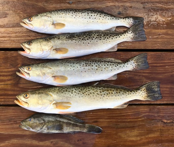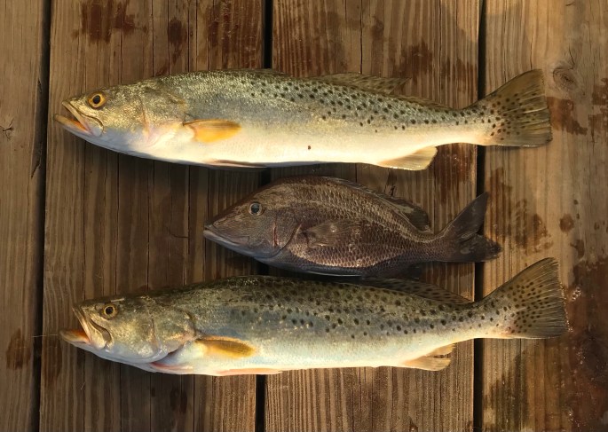 But the Dardens persevered and brought these beauties back to KBL. The trout ranged from 15.5″ to 18″. At the bottom was the black seabass, extending beyond 10″ (the legal size needed).
