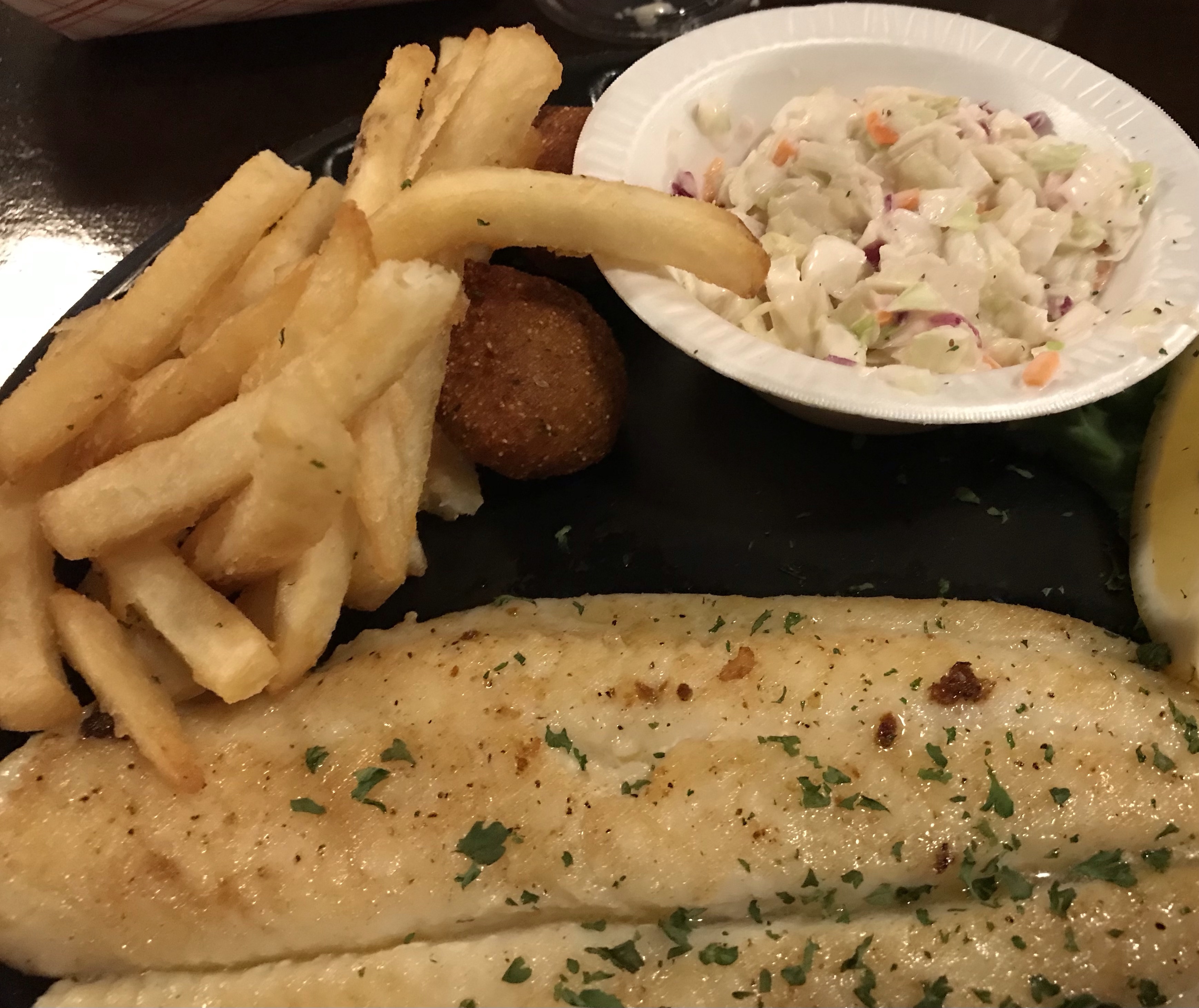 Eric always goes for a dozen crabs – steamed with old bay seasoning (spicy!) – while I ordered the grilled grouper, complete with fries and a (very) delicious cole slaw. Yes, it looks like ‘normal’ cole slaw, and it is………but it definitely hits the spot when eating at this locale.