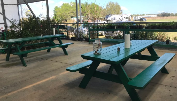 After parking, these picnic tables were under cover with plants for sale along the edges.