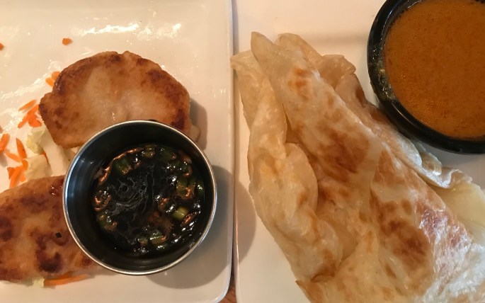 Left you have 2 potstickers (we ate the other 3 so fast, didn’t get a photo) with roti canai malaysian flat bread and spicy dipping gravy on the right.