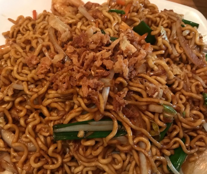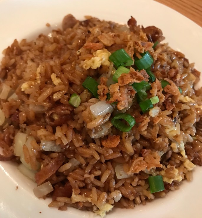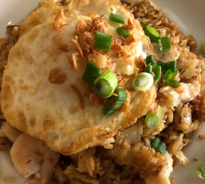 I’m always up for fried rice or Nasi goreng Indonesia – fried rice with an egg, simple yet satisfying. Wok-fried shrimp and chicken are hidden under that egg.