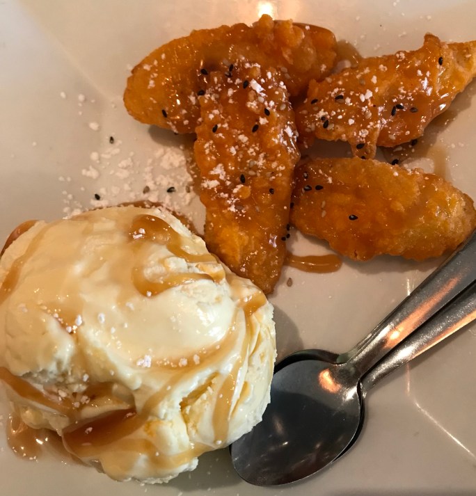 Can you have a meal without dessert? A rhetorical question usually. We tried the fried banana – battered and deep fried, dusted with powdered sugar, drizzled with honey and caramel, topped with sesame seeds, served with vanilla ice cream. It was good, maybe not a repeat, but satisfying none the less.