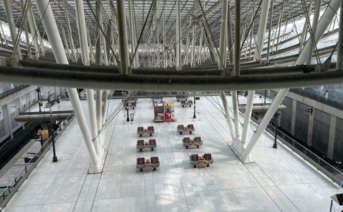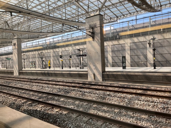 Our flight landed 1+ hour late and a number of passengers were going to miss their connections. Not us, we are stopping at Paris, to catch our first train. No trains here yet, it was a very empty platform.