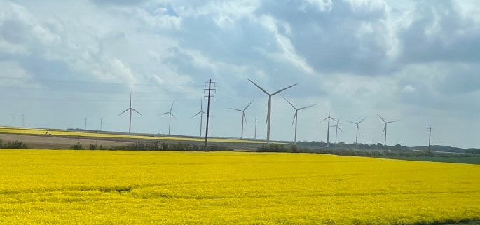 We flew past more yellow fields and starting seeing wind turbines along-side.