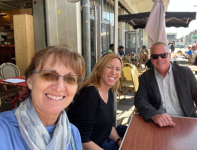 We cut the sandwiches in quartesr for the group to taste more than one type if they chose. I had the chicken – absolutely delicious. Definitely one of the best chicken sandwiches I had tasted. Adrienne had the veggie option and also said it was one of the best. We made it a ‘picnic’ sitting in one of the many city squares. The two in the background were part of our tour with the guide, Lou to the left.